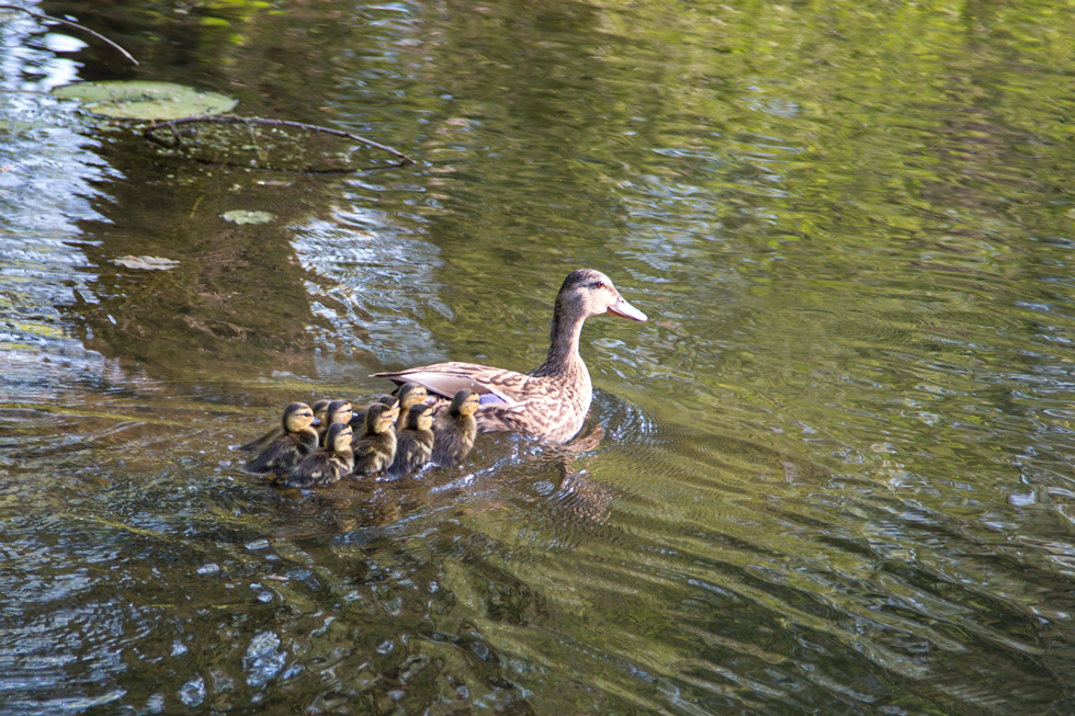 I looked out the window this morning around 7:15 a.m. and saw our Mama duck waddling around with 9 little fuzzy balls of fluff in tow. She was searching urgently for a way out of the fenced yard. I called Annette out and we opened the gate and gently shepherded them out to the front. Then it was a 1/2 mile march with them to the Yahara River during the morning commute. Traffic was heavy (for Stoughton) so I am so glad that we were here to play crossing guard. We had to stop cars a few times and it was a bit nerve-wracking but they made it safely and really very quickly. At one point we lost them when they beelined through a couple yards and they had to jump off a 2.5 ft. retaining wall before crossing one of the busiest streets in town. It reminded me of the book, Make Way for Ducklings that I read when I was a kid. Does anyone else remember this book? Dawn?