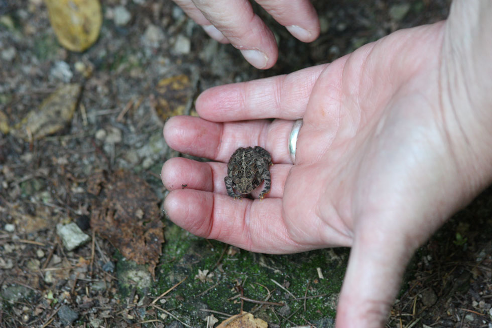 Earlier in the spring we walked in the same place and saw literally thousands of tiny toads hopping on the path in the woods. I’m sure not too many survived but this little guy did.